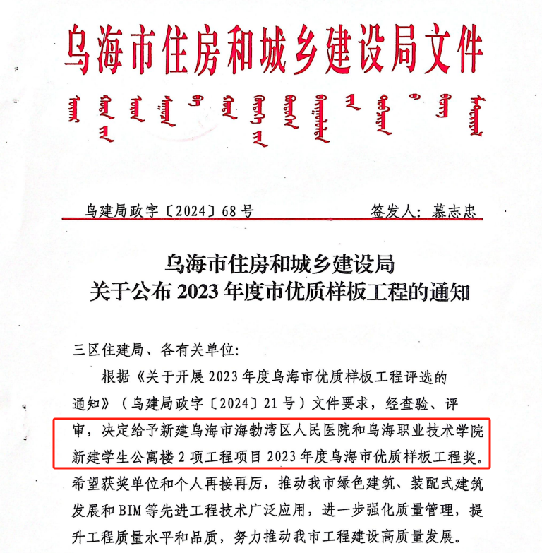 近日,烏海市住房和城鄉(xiāng)建設(shè)局發(fā)布了《關(guān)于公布2023年度市優(yōu)質(zhì)樣板工程的通知》名單,由城建公司承建的烏海市職業(yè)技術(shù)學院新建學生公寓樓項目榮獲2023年度烏海市優(yōu)質(zhì)樣板工程獎。