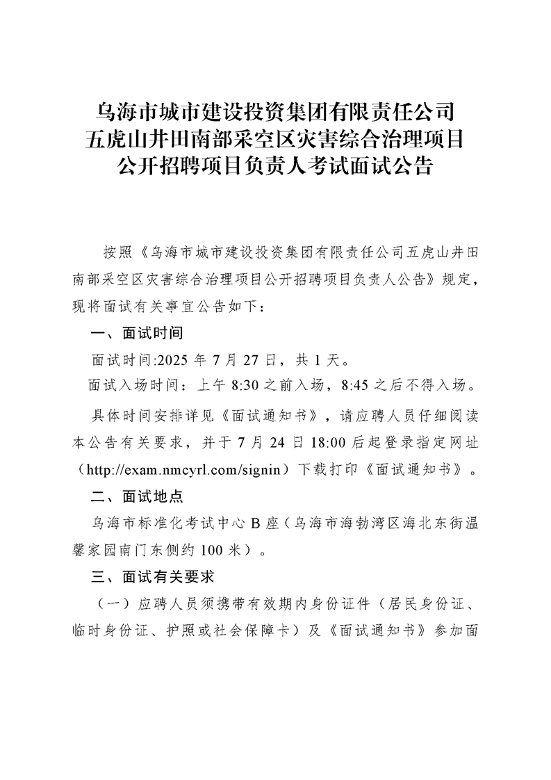 烏海市城市建設投資集團有限責任公司五虎山井田南部采空區(qū)災害綜合治理項目公開招聘項目負責人考試面試公告