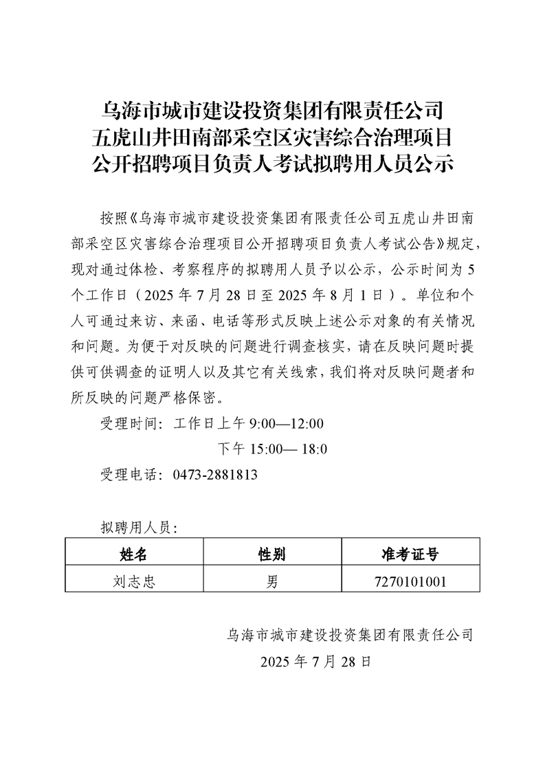 烏海市城市建設投資集團有限責任公司五虎山井田南部采空區(qū)災害綜合治理項目公開招聘項目負責人考試擬聘用人員公示